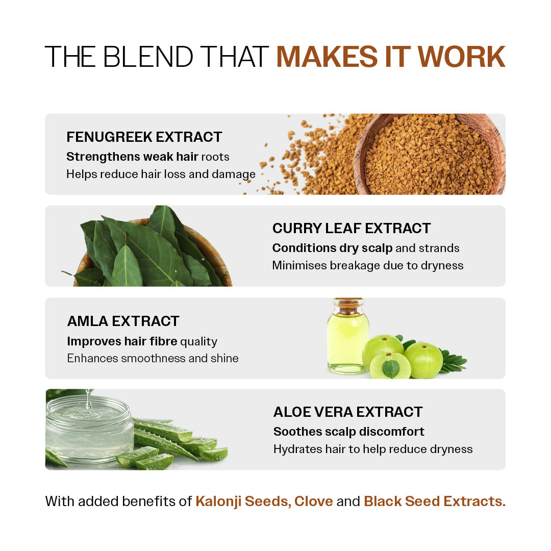🍃 Curry Leaf Extract – Conditions dry strands and minimises breakage